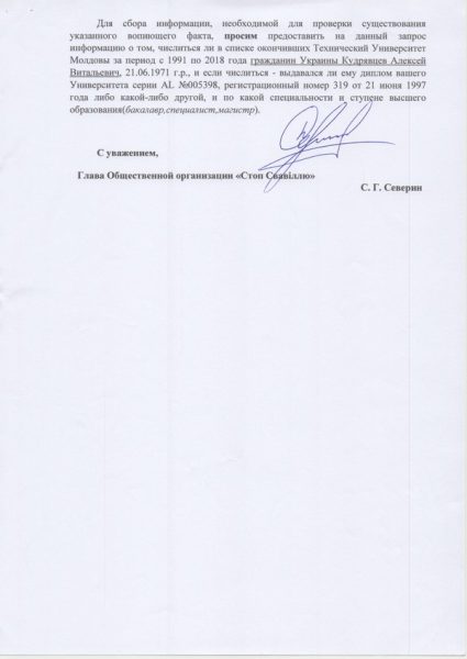 21 ноября 2018 года активистами ГО «Стоп Свавіллю» был направлен запрос в адрес Технического Университета Молдовы, с просьбой предоставить информацию о том, числится ли в списках окончивших вышеуказанный ВУЗ за период с 1991 по 2018 годы гражданин Украины Кудрявцев Алексей Витальевич, 21.06.1971 года рождения.
