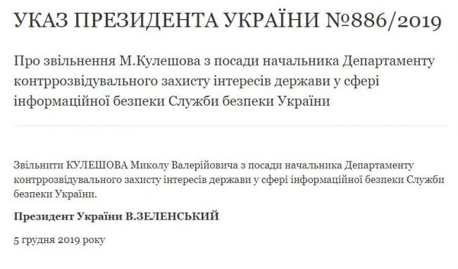 5 декабря 2019 года указом Президента Украины с должности начальника ДКИБ (департамент контрразведывательной защиты интересов государства в сфере информационной безопасности) СБУ уволен одиозный полковник Николай Кулешов. Из неофициальных источников стало известно, что одной из причин увольнения послужил громкий скандал с “жучками”. Специальные технические средства для прослушки были найдены специалистами СБУ на “Объекте”, как называют службисты Офис Президента Украины. Скорее всего это увольнение фактически является приговором для его дальнейшей карьеры и службы, так как по правилам указы идут парой – один об увольнении, а второй, следом за ним, о назначении на другую должность. Похоже на то, что председатель СБУ Иван Баканов понял, что его обманули, не только с «жучками», но и с пиаром, который 3 месяца назад устроил Кулешов с расследованием деятельности якобы хакеров и даркнетом для того, что бы получить повышение.