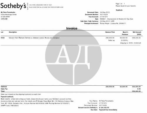Счет (инвойс) от Sotheby’s был выставлен непосредственно на имя Порошенко — 4 мая 2012 года, в котором указано, что доставка осуществляется в г. Киев, индекс 01008 на улицу Грушевского, 9. То есть, в личную квартиру Порошенко возле ВР.