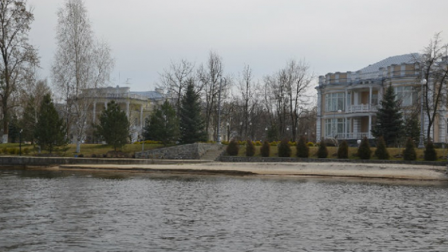 Главное строение по виду напоминает Белый дом в Вашингтоне. На территории поместья находится собственная часовня. По словам местных жителей, столь грандиозная стройка заняла порядка девяти лет. Часть снимков сделана с лодки, еще одна – с крыши прилегающего санатория для глухих «Ивушка».