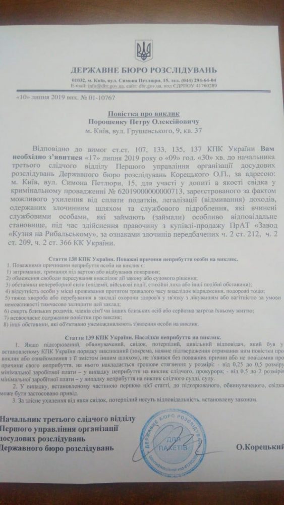 Цель вызова — участие в допросе в качестве свидетеля в уголовном производстве №62019000000000713 касательно возможного уклонения от уплаты налогов, отмывания преступных доходов при купле-продаже завода «Кузня на Рыбальском».
