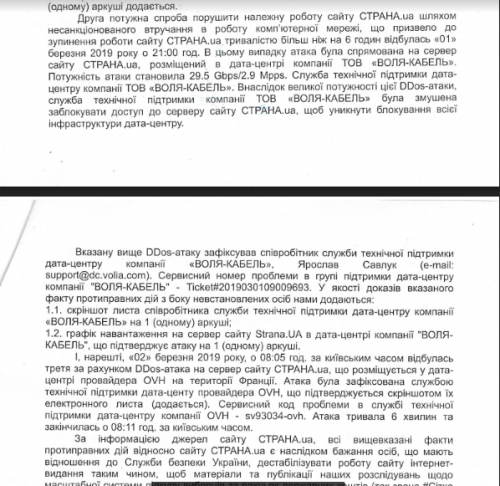 Сервисный код проблемы в службе поддержки датацентра компании OVH, подтверждающий противоправное вмешательство в работу сервера сайта Страна.ua, находящегося на территории Евросоюза — sv93034-ovh. Атака была зафиксирована службой поддержки датацентра компании OVH, что подтверждает скриншот их письма (имеется в распоряжении редакции).