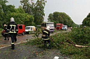 У Тернопільській області потужний вітер повикорчовував дерева та завалив ними сім кілометрів автостради державного значення Тернопіль-Львів. Рух автомобілів на трасі зупинився.