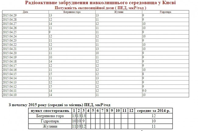 По официальным данным Украинского гидрометеорологического центра, 29 апреля по состоянию на 10:30 радиационный фон в Киеве составляет 11 мкР/час (норма – 8-12 мкР/ч). Радиационная обстановка стабильная, мощность экспозиционной дозы на поверхности грунта и содержание радионуклидов в воде не превышают нормативных значений.