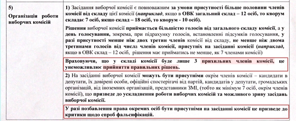 Ну і головне. Автори документу вважають ризикованим гарантоване законом право спостерігачів, представників ЗМІ, кандидатів у депутати та їх представників бути присутніми на засіданні комісії. За думкою авторів, це "призведе до ускладнення роботи виборчих комісій та можливого зриву засідань виборчої комісії".