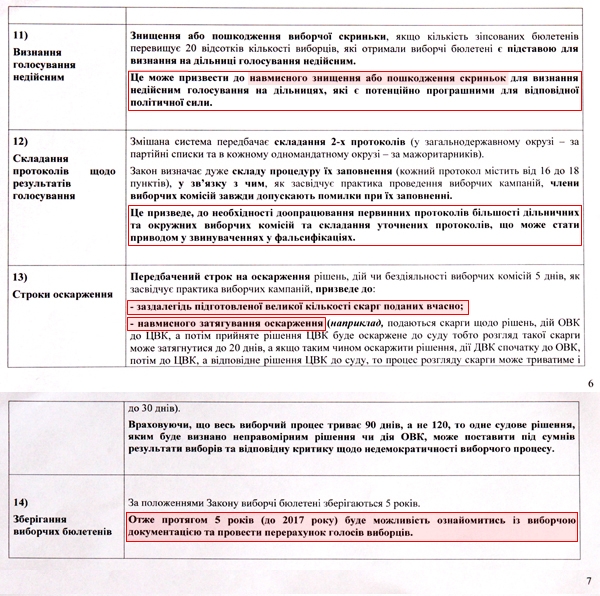 По-перше, у провладній команді вважають загрозою право спостерігачів від громадських організацій на оскарження рішень та дій виборчих комісій. Як зазначається у документі, "це може спричинити надходження величезної кількості скарг, підготовлених заздалегідь, виключно з метою дискредитації виборчого процесу. І навіть правомірна відмова у їх задоволенні призведе до критики у спробах фальсифікацій та недемократичності виборчого процесу".
