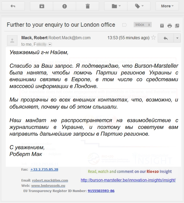 Получив подтверждение, мы, на всякий случай, решили направить в офис Burson-Marsteller UK официальное письмо с просьбой подтвердить сотрудничество с Партией регионов и первым заместителем Генерального прокурора Ренатом Кузьминым. И к нашему удивлению меньше чем через десять часов мы получили официальное подтверждение.