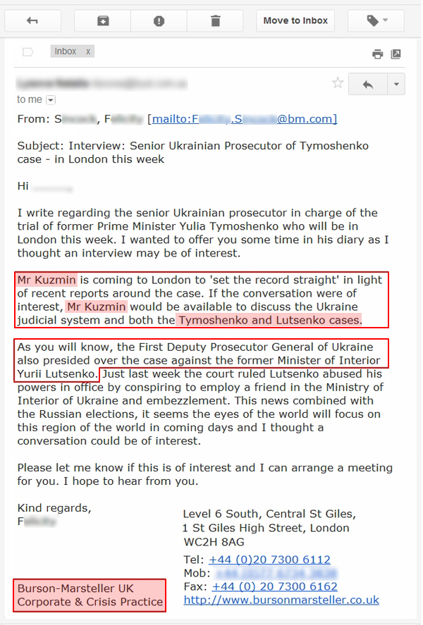 В распоряжении "Украинской правды" оказались копии писем, которые были разосланы одной из сотрудниц Burson-Marsteller UK в редакции британских СМИ с предложением взять интервью у Рената Кузьмина относительно уголовных дел против Юлии Тимошенко и Юрия Луценко.
