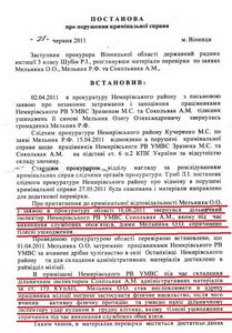 Прокуратура Винницкой области отказалась признавать наличие преступлений в действиях милиционеров. Только после скандальной публикации в местной газете «33 Канал» прокуроры, опасаясь позора и презрения, отменили «отказное постановление» и начали новую проверку. Впрочем, вместо справедливости и непредвзятости, возглавляемая Александром Мрихиным прокуратура Винницкой области продемонстрировала подлость, беззаконие и цинизм. Через три месяца (!) после инцидента один из милиционеров, причастных к избиению Олега Мельника, вдруг вспомнил, что, якобы Олег сломал руку об тело этого милиционера, избивая его (милиционера) в милицейском кабинете. В результате лично заместитель прокурора Винницкой области Роман Шубин возбудил уголовное дело не по факту приведшего к инвалидности избиения милиционерами Олега Мельника, а в отношении самого Олега за насилие в отношении сотрудника милиции…