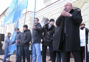 Представители Партии регионов через некоторое время приблизились к стенам обладминистрации с флагами и транспарантами: Украина для людей!, Янукович - наш Президент!. В это время, не успев высказать до конца свои лозунги, в ПР полетел мусор вместе с яйцами.