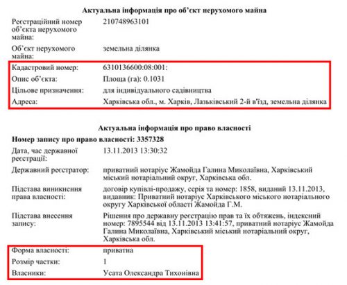 Дополнительно следует остановить внимание на теще Виталия Усатого. Пенсионерка Сидякина Ирина Васильевна в 2015 и 2016 годах купила два земельных участка и дом на 533 кв. м. под Харьковом. За недвижимость она из собственного кармана заплатила 1 млн 990 тыс грн, то есть почти два миллиона. В начале 2015 года, когда осуществлялась сделка, официальный курс доллара по отношению к гривне составил 16.15, следовательно, сумма могла достигать 123 000 долларов.