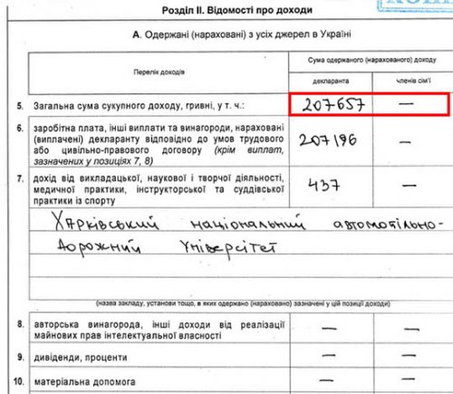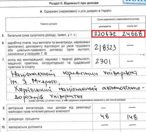 В последующие периоды супруги тоже не имели дополнительных источников финансовых поступлений. По нашим подсчетам, Виталий Александрович с 2012 по 2017 годы заработал 1 млн 502 тыс 251 грн и стал основным кормильцем в семье, тогда как жена в семейный бюджет принесла гораздо меньше — 218 932 грн.
