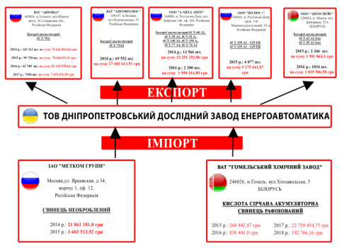 Так, в 2015 году предприятие поставило российскому ООО «Полюс +» (Ростов-на-Дону) 4 тыс. 77 шт. аккумуляторов на сумму 9,2 миллиона гривен. В 2014-2016 гг. «Энергоавтоматика» продало 15 тыс. 866 шт. аккумуляторов ростовскому ООО «А-Мега Авто» на 14,2 миллиона гривен. А в 2014 году украинские аккумуляторные батареи 6СТ-70А2 с завода Петра Порошенко получило московское ОАО «Автофрамос».