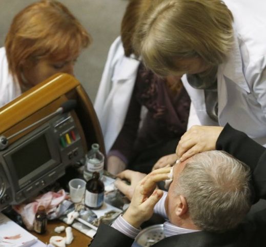После этого началась потасовка, в результате которой пострадал регионал Владимир Малышев, ему разбили лоб, и оппозиционер Степан Кубив, у него рассечена губа. Депутату от ПР оказали медицинскую помощь.