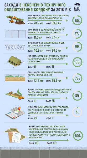 Объем работ и их стоимость в расчете на каждый год четко определены бюджетной программе «Мероприятия по инженерно-технического обустройства границы». Однако сопоставление годовых паспортов этой бюджетной программы и отчетов об их выполнении показало, что между запланированными показателями и фактически выполненными во всех случаях есть существенная разница. Например, протяженность оборудованных в 2017 году противотанковых рвов и траншей должна составлять 110,3 км, однако показатели выполнения составляют 5%, — то есть за год было выкопано 5,2 км противотанковых рвов и траншей. Во исполнение этой задачи было потрачено 1600000 грн вместо 30100000 грн запланированных.