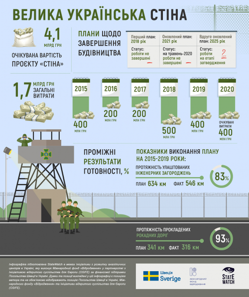 Согласно информации, которую получила общественная организация StateWatch от Государственной пограничной службы, реализации проекта «Стена» планируется перенести еще на 4 года и завершить до 2025 года. Общая ожидаемая стоимость проекта составит 4100000000 гривен. По словам пограничников, необходимость продления сроков обустройства границы обусловлено уменьшением финансирования, а также ростом стоимости строительных материалов, работ и услуг.