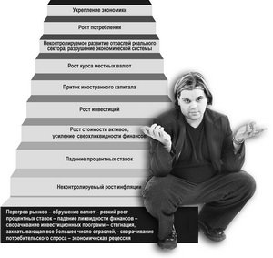 - «Пузырь» возникает всегда в недрах стремительно развивающихся экономик, - рассуждает экономический эксперт Андрей Мартынов. - Тот или иной товар на рынке быстро переоценивается, далеко «отрываясь» от своей себестоимости и здравого смысла. Чем моложе и хрупче экономика, тем больше в этой стране переоценивается товар. Например, американская недвижимость была переоценена в некоторых сегментах рынка в 1,5-2 раза. При этом украинская, рынок которой существовал менее 10 лет, но спешил вслед за американским, - в 3-5 раз. «Пузырь» накачивается, обесценивая деньги, и будет дуться до тех пор, пока у людей будут эти деньги. Ажиотажный спрос, вызванный теми или иными причинами, может увеличить пузырь в разы в течение нескольких недель. Живой пример: рост цен на нефть на фоне военных конфликтов или - удорожание продовольствия, толчком к которому стали прошлый неурожайный год плюс катастрофа в Японии.