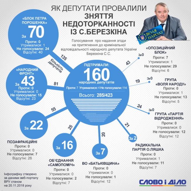 Ни одного голоса в поддержку снятия неприкосновенности с Березкина не дали фракция «Оппозиционного блока», группы «Видродження» и «Воля народа».