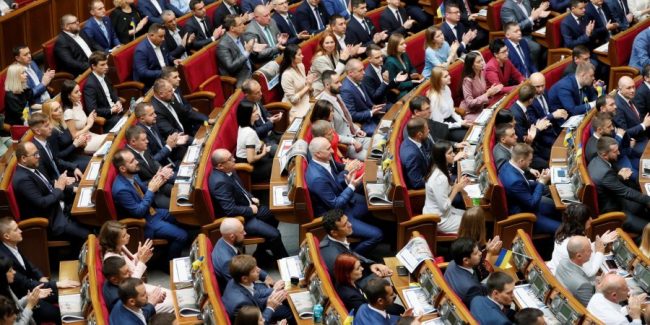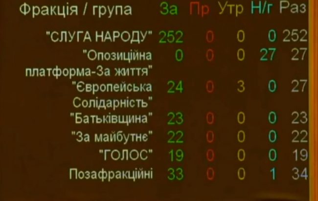 «За» проголосовали 252 нардепа из фракции «Слуга народа», 24 — фракции «Евросолидарность», 23 – фракции «Батькивщина», 22 — группы «За будущее», 19 — фракции «Голос». Еще 33 голоса дали внефракционные депутаты.