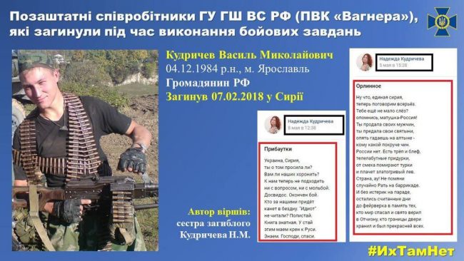 34-летний Василий Кудричев также погиб 7 февраля в сирийском городе Дайр-эз-Заур. В честь погибшего военного его сестра написала стихотворение со строками: "России нет. Есть треп и блеф".