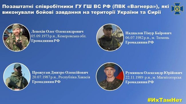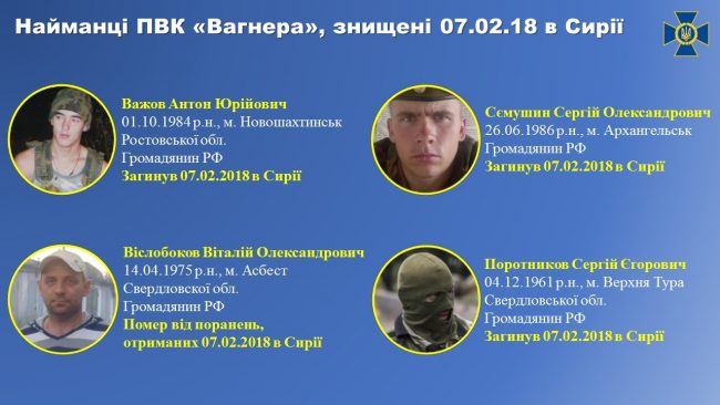 Служба безопасности Украины раскрыла личности группы наемников частной военной компании "Вагнер", которые принимали участие в оккупационной войне на Донбассе. Все они погибли в 2018 году в ходе боевых действий в Сирии.