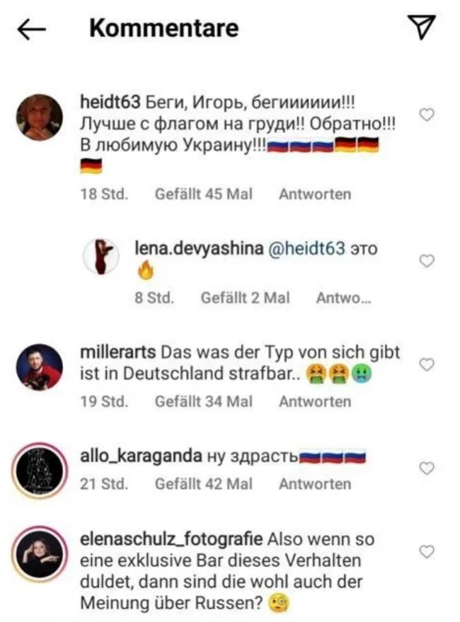 «Предполагаю, что именно кто-то из них нанял ботов, которые стали приходить на страничку ресторана в Instagram и писать там нелестные отзывы. Они обвиняли меня в расизме, хотя никакого расизма в моих словах не было. Я сам говорю на русском языке, я родом из Одессы, моя мама из Петербурга, отец беларус. Я просто предупредил россиян, что далеко не все им тут рады. На подбор выражений времени у меня не было. Баден многонациональный спокойный город, но в больших городах у них могут быть проблемы. Я только на третий день узнал, что мои слова вызвали вдруг такую реакцию. Я специально просмотрел кто писал комментарии, могу сказать, что 90% там были боты. Примерно 200-300 сообщений появились практически в одно время», – говорит Игорь.