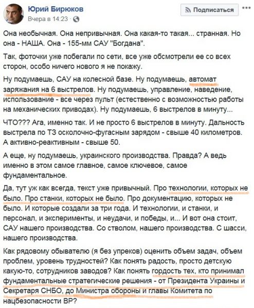 Затем эстафету подхватил (уже в Фейсбуке) советник президента Украины и помощник министра обороны (тоже Украины) Юрий Бирюков, выложивший на своей странице восторженный отзыв о «Богдане». Ну, не только о ней, но и о своих боссах – президенте и министре обороне, которые, по словам Бирюкова, «принимали фундаментальные стратегические решения». Интересно, какие? Они с нуля поднимали тяжелую промышленность, как когда-то Серго Орджоникидзе, они строили в пустынной степи гигантские заводы, или хотя бы запустили ныне существующие? Нет. Тогда о чем это он?