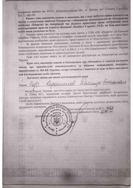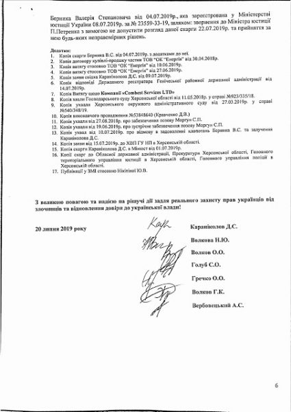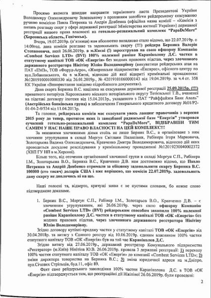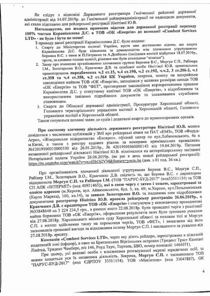 Как сообщается в письме, в пятницу, 19.07.2019 г., руководству фирмы случайно стало известно, что 22.07.2019 г. в 14:00 Комиссия Минюста по рассмотрению жалоб в сфере регистрации рассмотрит и удовлетворит жалобу (!!!) рейдера Берника Валерия Степановича, который 26.06.2019 г. в Киеве (!) зарегистрировал на свою оффшорную компанию “Combest Services LTD” (BVI) 100% принадлежащей ранее Караниколову Д.С. доли в уставном капитале ООО “ОК “ Энергия” без каких-либо правовых оснований, через государственного регистратора Никитину Юлию Владимировну (виновницу рейдерских атак на ОАО “ЕМЗ “, ООО “Форуд-Агро”, “Жмеринское предприятие “Экспресс”, офисный центр по ул. Лобановського, 4а в г. Киеве и в отношении действий которой зарегистрирован ряд уголовных производств: №12019100010000530 от 26.01.2019 г., №42019101060000143 от 19.04.2019 г. по ч.4 ст. 358 УК Украины “Использование заведомо подложного документа” и ).