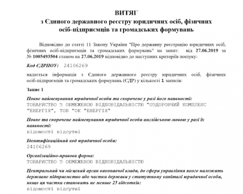 Согласно выписки от 27.06.2019 г., государственный регистратор коммунального предприятия “Регистратор” (г. Киев) Никитина Ю.В. 26.06.2019 г. провела 3 государственные регистрации: 1) перехода 100% доли уставного капитала ООО “ОК “Энергия” к компании “Combest Services LTD”; 2) изменения директора общества на Берника В.С.; 3) изменение юридического адреса на г.Днепр, Сечевых Стрельцов, д.11, офис 89.