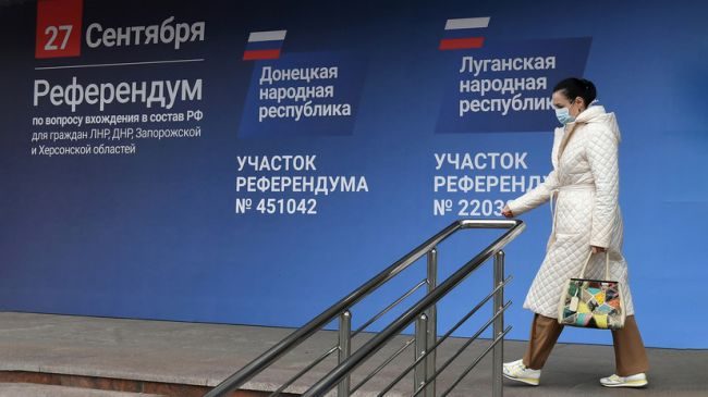 На оккупированной Херсонщине оккупанты озвучили показатель 87,05% голосов поддержки за присоединение к России. Позже в так называемой «ЛНР» сообщили, что 98,42% жителей региона «за», а в «ДНР» якобы за вхождение в состав России — проголосовали 99,23% при явке в 97,51%. При этом глава Луганской областной военной администрации Сергей Гайдай сообщил, что в «референдуме» в Луганской области приняли участие столько же людей, сколько имели право голоса десять лет назад – с учетом сотен тысяч эвакуированных и эмигрантов. По его словам, на выборах народных депутатов Украины в октябре 2012 года, когда еще голосовала вся Луганская область, в списки были включены 1,829 млн. человек, практически столько же людей «проголосовали» за вхождение временно оккупированных территорий в состав РФ.