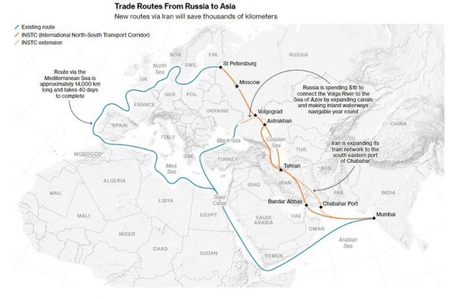 Обе страны тратят миллиарды долларов на ускорение доставки грузов по рекам и железным дорогам, соединенным Каспийским морем. Данные отслеживания судов, собранные Bloomberg, показывают, что десятки российских и иранских судов, включая некоторые, находящиеся под санкциями, уже курсируют по этому маршруту.