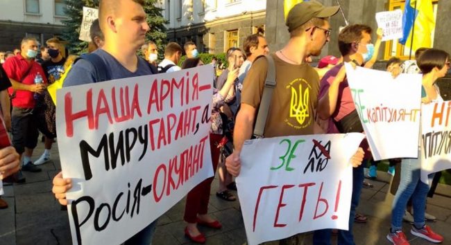 В понедельник, 27 июля, на Донбассе заработал режим всеобъемлющего прекращения огня. По этому поводу «Рух опору капитуляции» организовал протест, на котором обвинил президента Владимира Зеленского в государственной измене, подчеркнув, что украинская армия атакована с тыла.