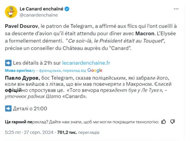 Во время задержания Павла Дурова он заявил полицейским, что у него был запланирован ужин с Макроном, ради чего он и прилетел в Париж. Однако в Елисейском дворце эти заявления официально опровергли.