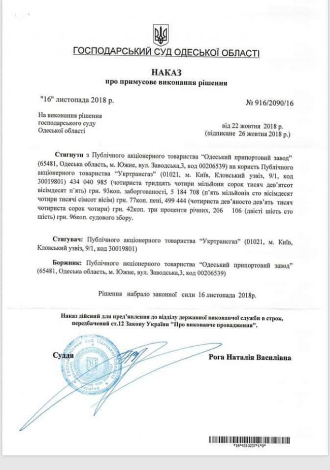 Хозяйственный суд Одесской области издал приказ о принудительном взыскании с "Одесского припортового завода" в пользу ПАО "Укртрансгаз" 440 млн гривен.