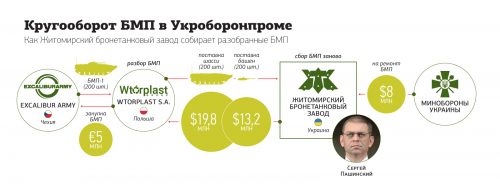 Далее ЖБЗ завозил все это по отдельности в Украину: каждая башня оценивалась в $66 тыс., а каждое шасси — по $99 тыс. Завод «ремонтировал» БМП — попросту соединял ранее разобранные части. Стоимость работ составляла еще $40 тыс. за единицу.