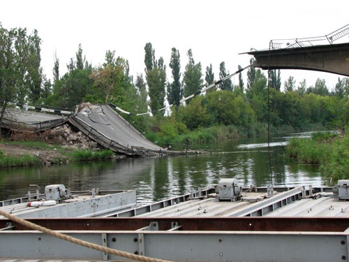 Зрелище, которое с трудом укладывается в голове. Грунтовка выводит на наведенный армейцами понтон. Легковушки, грузовики-длинномеры и автобусы с пассажирами медленно катят по громыхающей и покачивающейся переправе. Глаза всех проезжающих устремлены на висящие пролеты моста. Выражение глаз у всех одинаковое: ужас и неверие в увиденное. Увы.