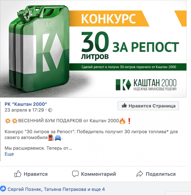 Кроме того, время от времени Сергей Позняк делает рекламные вбросы в социальную сеть, рекламируя услуги, предоставляемые его автоломбардом перед абсолютно не целевой аудиторией и разыгрывая канистру бензина среди читателей его "благочестивой странички". Результатом столь хитрого маркетингового хода может служить количество откликов, ограничившихся 6 (!) пользователями, включающими самого Позняка и еще 5 сотрудников его конторы.
