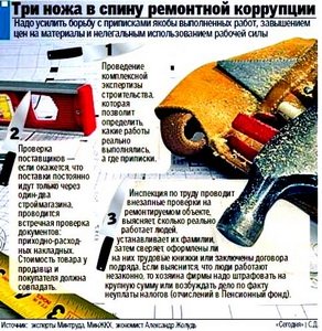 Ремонты офисных помещений во все времена считались «золотым дном» для воровства государственных денег, утверждает Евгений Л., до недавних пор (вышел на пенсию) работавший начальником строительной фирмы, образованной на базе бывшего советского строительно-монтажного управления. Благодаря этому Евгений имел связи среди властьимущих — бывших партийных и советских чиновников районного уровня, что позволяло получать выгодные заказы на ремонт офисов. Евгений раскрыл нам основные схемы отмывания денег при ремонтах.