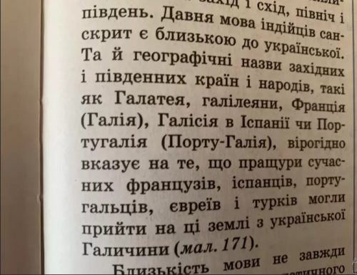 «… расселились на восток и запад, север и юг. Древний язык индийцев санскрит является близким к украинскому языку. И географические названия западных и южных стран и народов, такие как Галатея, галилеянин, Франция (Галлия), Галисия в Испании или Португалия (Порту-Галлия), вероятно, указывает на то, что пращуры современных французов, испанцев, португальцев, евреев и турок могли прийти на эти земли с украинской Галичины», — говорится на 271 странице.