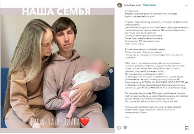 В частности, они писали о приеме сиропа «Рисдиплам», который (по их подсчетам) может обойтись в 150 тысяч евро в год. Также родители сослались на то, что нужно оплачивать пребывание в итальянской клинике. Однако точные суммы, которые им нужны, молодые родители назвать не смогли.