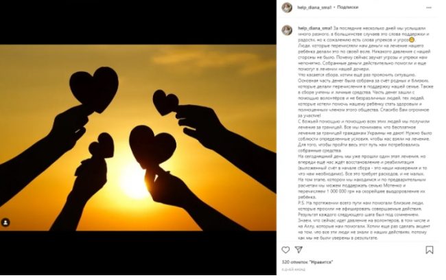 Правда, позже они написали, что их неправильно поняли и что якобы часть денег они все-таки передадут, но не сейчас. Потом даже заявили, что перечислят 1 миллион гривен некой семье Мотенко. Также родители решили отметить, что деньги на их карточки перечисляли также родственники, друзья и близкие знакомые.