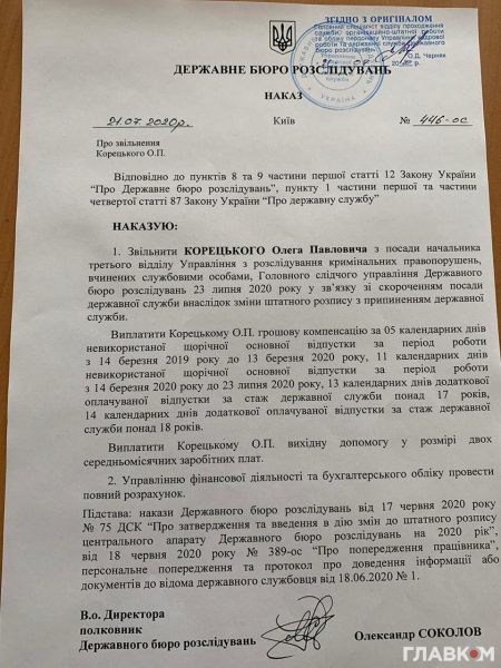 Об этом сам Корецкий рассказал «Главкому» и показал фото приказа за подписью и.о. директора, полковника ГБР Александра Соколова.
