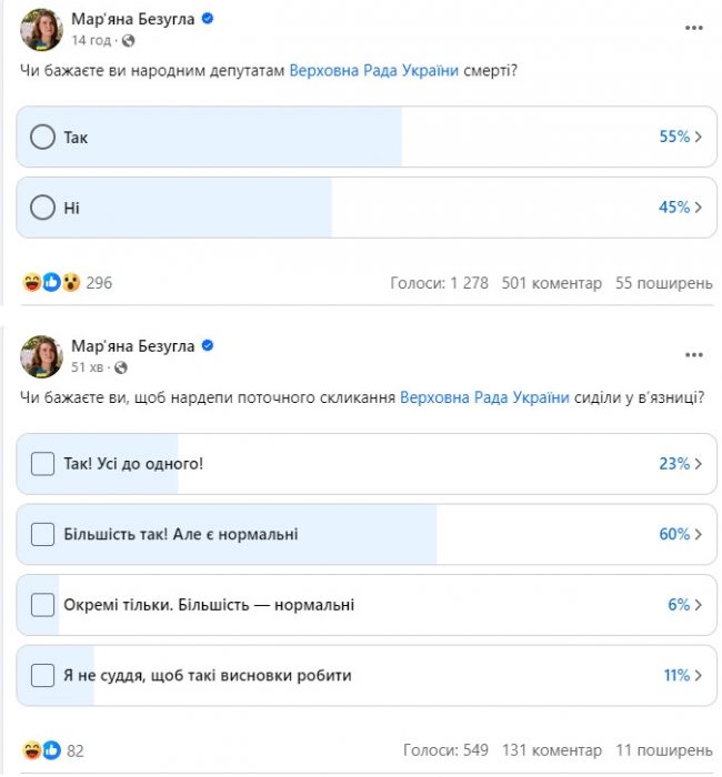 «Слуга народа» Марьяна Безуглая проводит в соцсети опрос среди украинцев относительно того, желают ли они смерти депутатам Верховной Рады.