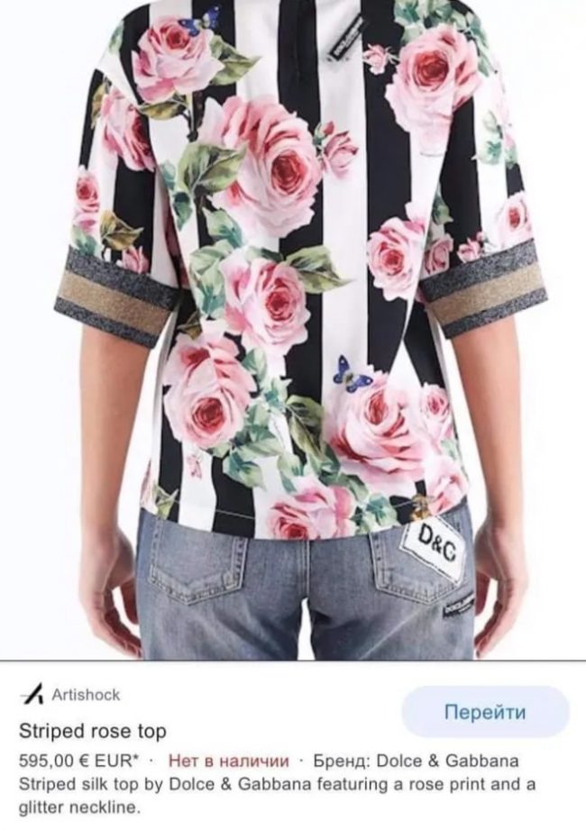 «Еще несколько лет назад узнаваемые «розы и полосы» D&G White Rose Striped были в тренде. Сейчас цена такого уже со скидкой – 595 евро или 20113 грн по курсу НБУ (средняя зарплата нардепа в месяц без «депутатских» 40 тыс. грн)» – отметила Стешенко.
