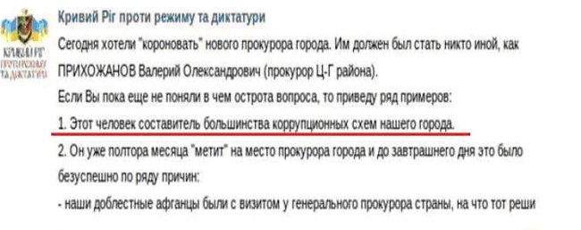 «При этом в Кривом Роге городе Прихожанова обвиняли в причастности к коррупционным схемам. Именно поэтому сразу после победы Революции Достоинства для него настали трудные времена. Горожане выступали против назначения Прихожанова на должность прокурора города. А 5 июня 2014 года активисты из Кривбасса даже пикетировали генеральную прокуратуру в Киеве, чтобы не допустить назначение Прихожанова на высокий пост. Под давлением возмущенной общественности Валерий Александрович написал заявление, что не будет вступать в должность без согласия громады города. Однако все таки поруководить в Кривом Роге успел, хоть и не слишком долго», — говорится в статье.