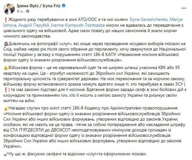 В свою очередь народный депутат от «Европейской солидарности» Ирина Фриз напомнила, что ни она, ни ее коллеги никогда не переодевались в военную форму во время поездок на Донбасс.