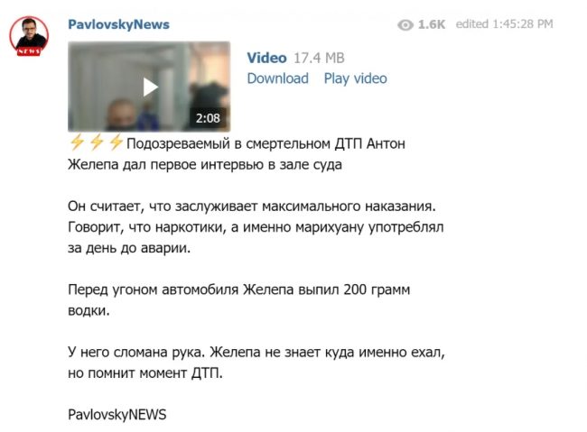Как написали на странице PavlovskyNews в Telegram, Желепа заявил, что за день до ДТП употреблял наркотики, а утром 12 июля, перед аварией, выпил 200 грамм водки.