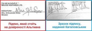 Однако Никия заявила, что Альтману не выдавались никакие доверенности от имени "Wilcox". В подтверждении этих слов Кагаловский представил образец подписи Никии. Не вооруженным взглядом видно, что подписи на документах различаются. Таким образом, можно утверждать, что доверенность является подделкой.