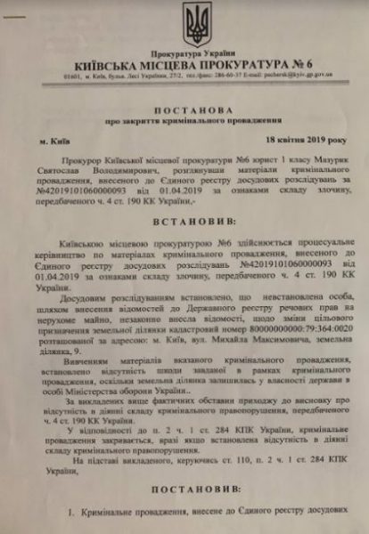 Вот, например 1 апреля Мазурик самостоятельно выявляет незаконную регистрацию по участку Минобороны на ул. Максимовича, 9 и открывает производство 42019101060000093, квалифицировав преступление по ч. 4 ст. 190 УК (мошенничество). Однако уже 18 апреля данное производства прокурор закрывает учитывая, что мошенничества как такового не произошло, так как … «земельный участок остался в собственности государства в лице Министерства обороны Украины».