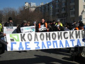 Помимо скандирования лозунгов, украинцы высказывали свое мнение посредством плакатов с надписями: "Нет ПРИВАТному небу", "Беня – вор", "Четверть года без зарплаты. Игорь Валерьевич, верни наши деньги!", "ПРИВЕТбанк, верни наши деньги", "Коломойский, где зарплаты?".
